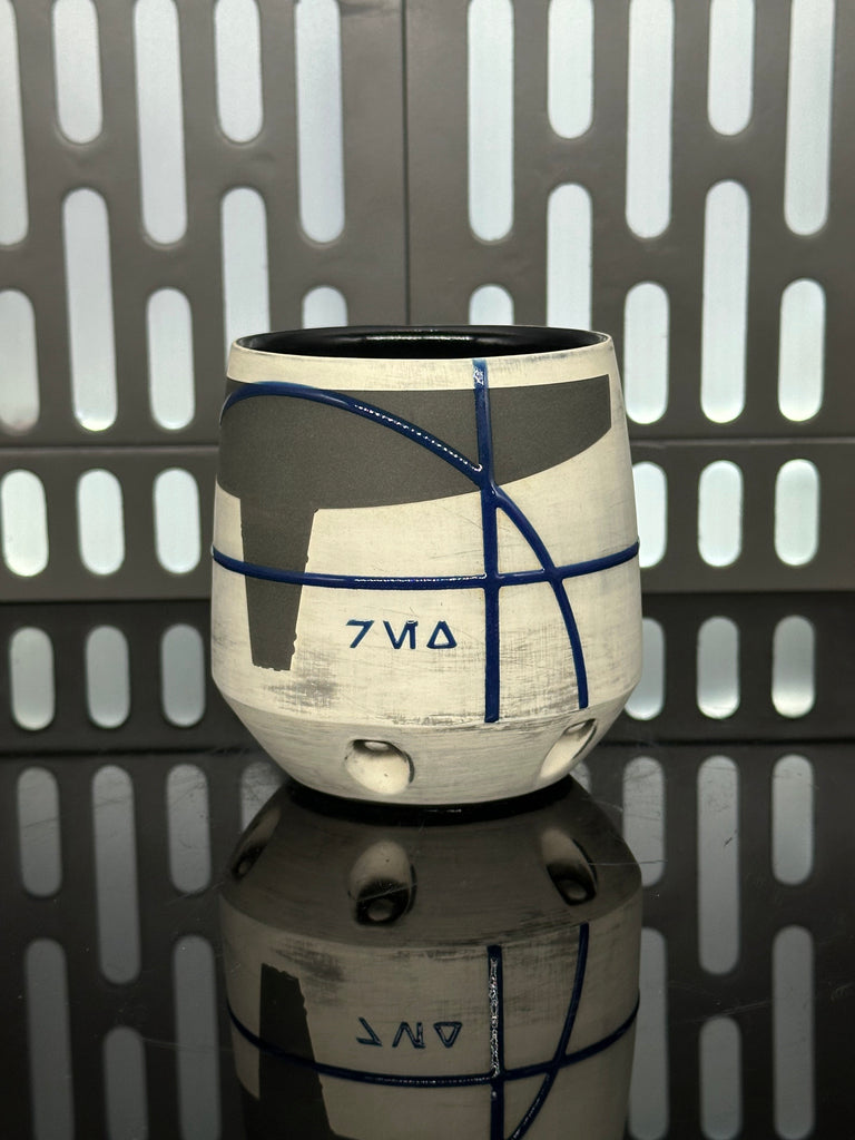 These pieces are inspired by Captain Rex. All pieces will be decorated in white terra sigillata with a pattern derived from the visor of his armor. Blue glaze will be used for the lines. The Aurebesh text reads Rex and includes a Jaig Eye symbol. Each piece is unique and will look similar to the picture but the placement of the pattern, lines, text and signet will change location making each piece unique. You can choose from various forms: Mug, Stein, Rocks Cup, Tumbler, Chili Bowl, Planter, and Serving Bowl.
