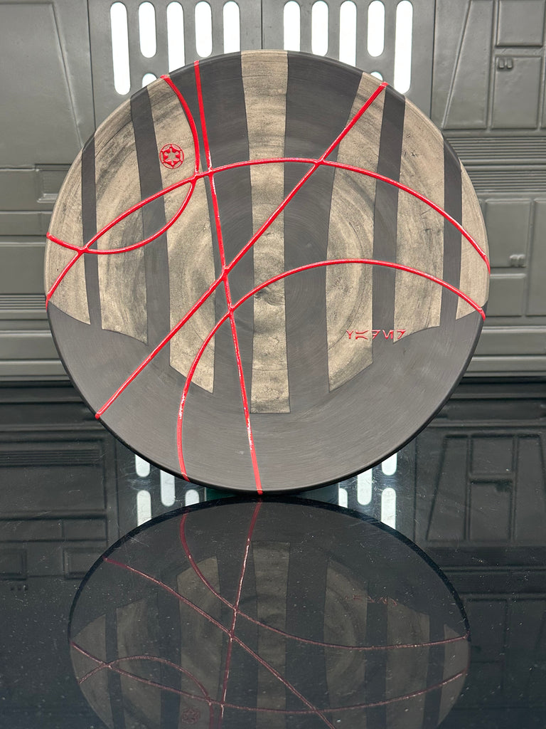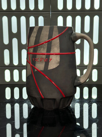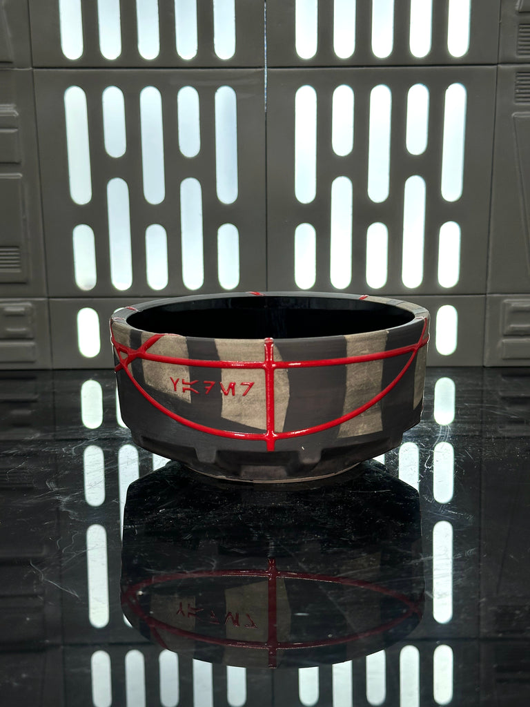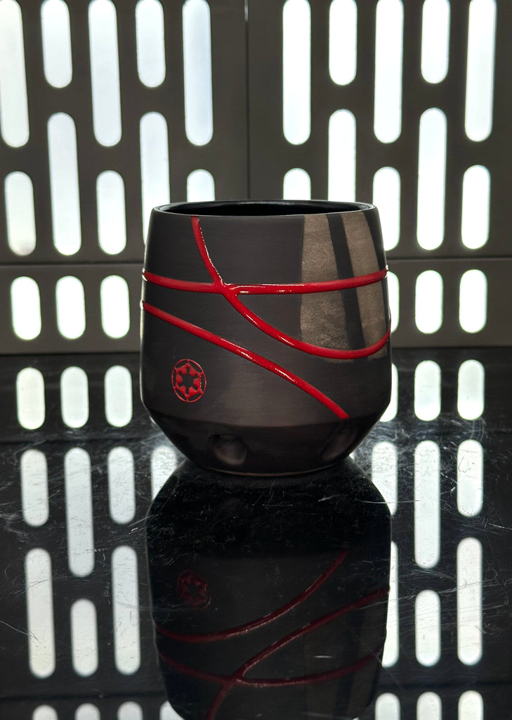 These pieces are inspired by Darth Vader. All pieces will be decorated in black terra sigillata with a pattern derived from the chest armor Vader wears. Red glaze will be used for the lines. The Aurebesh text reads Vader and includes a Galactic Empire symbol. Each piece is unique and will look similar to the picture but the placement of the pattern, lines, text and signet will change location making each piece unique. You can choose from various forms: Mug, Stein, Rocks Cup, Tumbler, Chili Bowl, Planter, and Serving Bowl.
