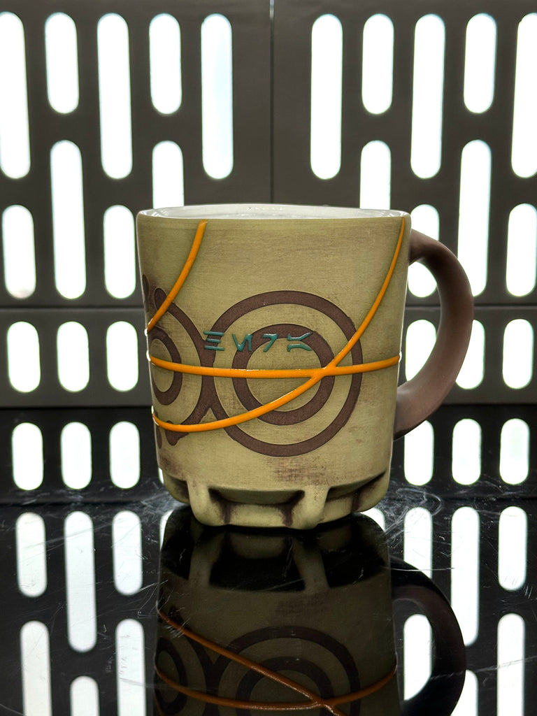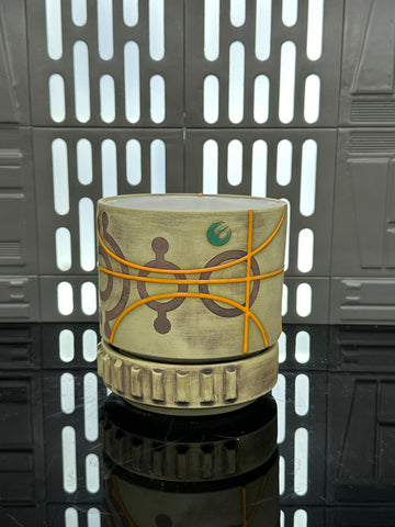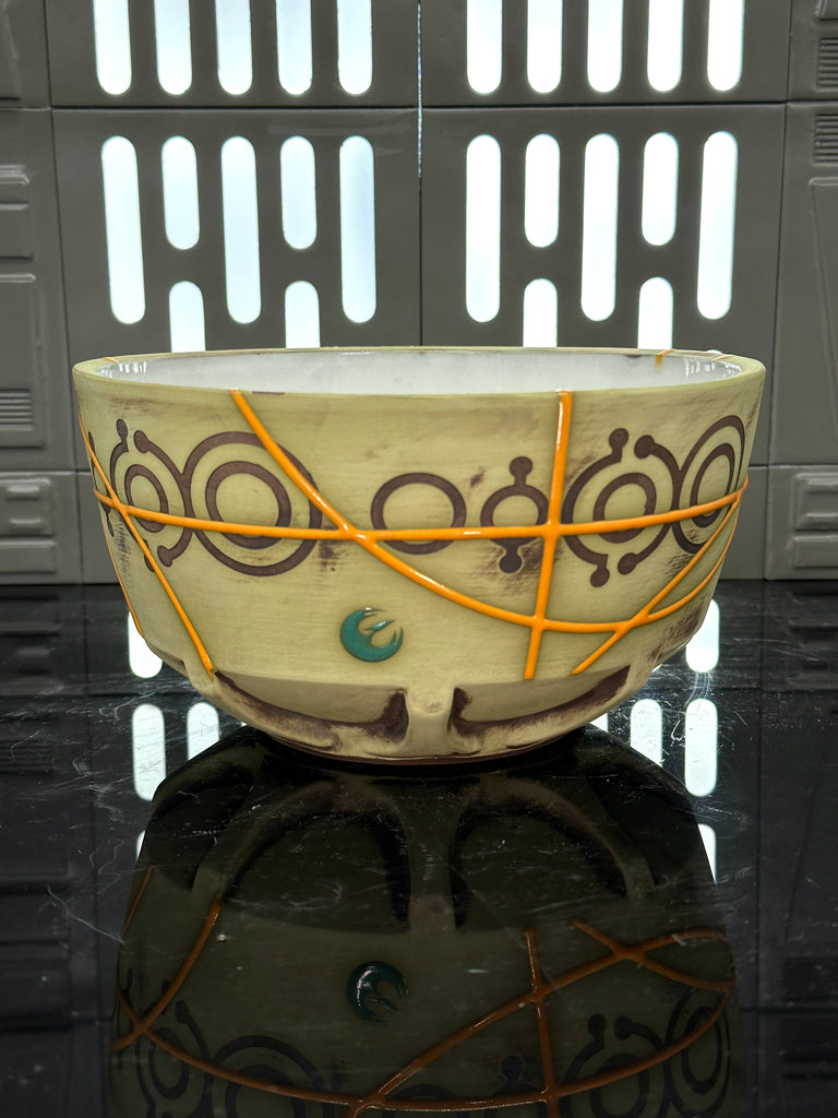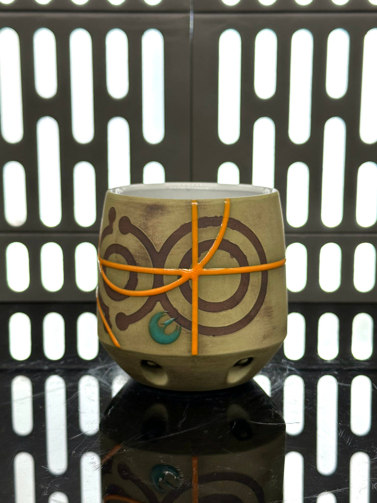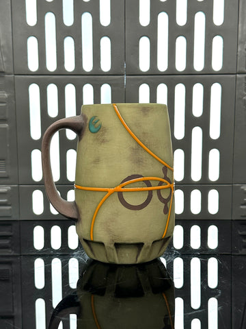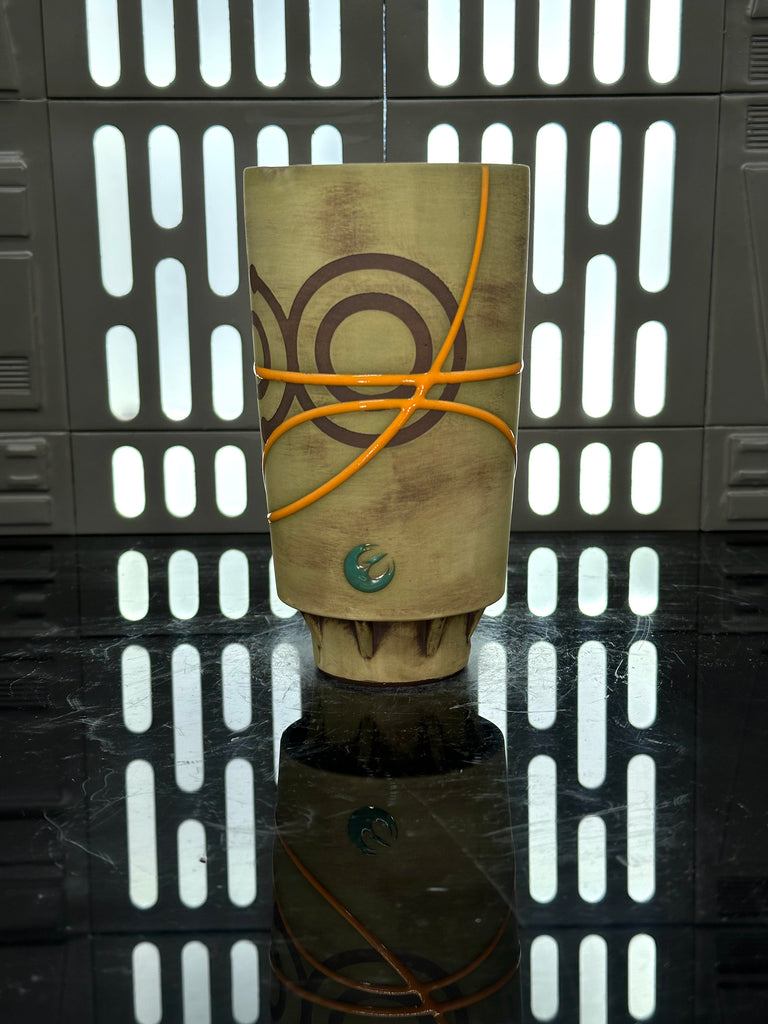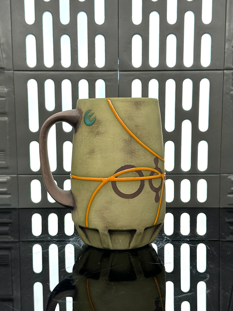These pieces are inspired by Hera Syndulla. All pieces will be decorated in green terra sigillata with a pattern derived from the markings on her lekku. Yellow glaze will be used for the lines. The Auebesh text reads Hera and includes a Pheonix Squadron symbol. Each piece is unique and will look similar to the picture but the placement of the pattern, lines, text and signet will change location making each piece unique. You can choose from various forms: Mug, Stein, Rocks Cup, Tumbler, Chili Bowl, Planter, and Serving Bowl.