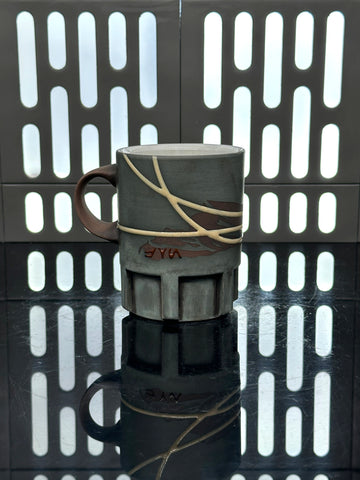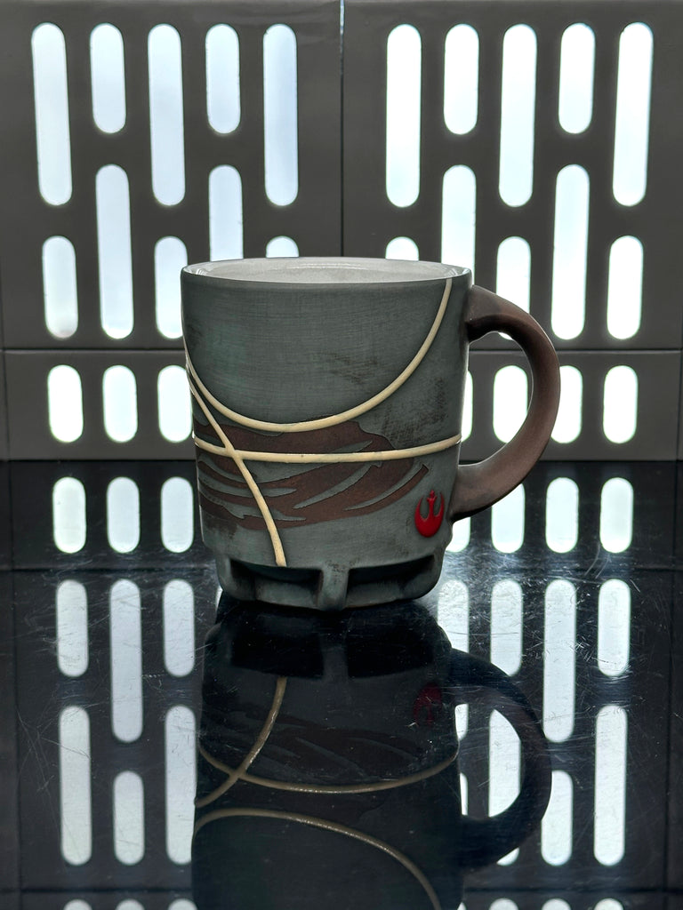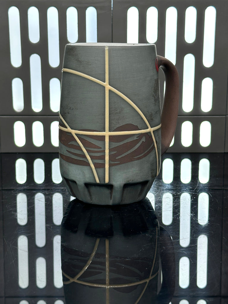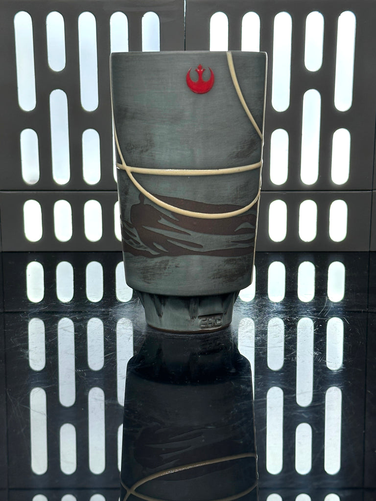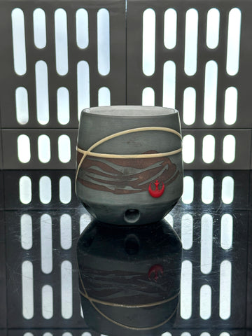 These pieces are inspired by Jyn Erso. All pieces will be decorated in white terra sigillata with a pattern derived from her scarf. Tan glaze will be used for the lines. The Aurebesh text reads Jyn and includes a Rebel Alliance symbol. Each piece is unique and will look similar to the picture but the placement of the pattern, lines, text and signet will change location making each piece unique. You can choose from various forms: Mug, Stein, Rocks Cup, Tumbler, Chili Bowl, Planter, and Serving Bowl.