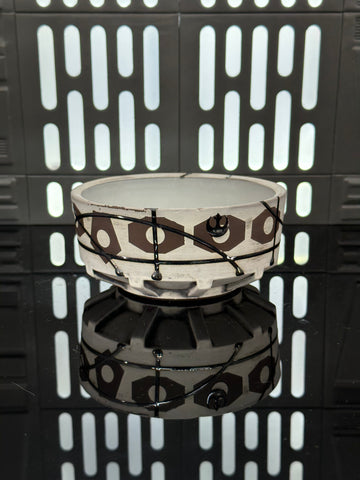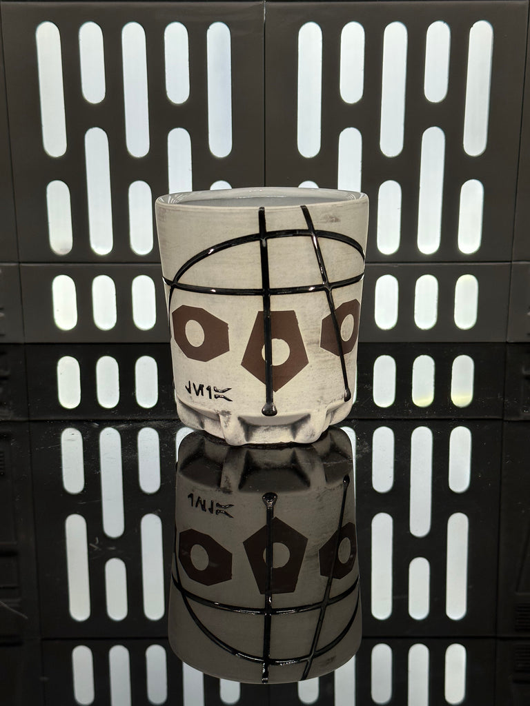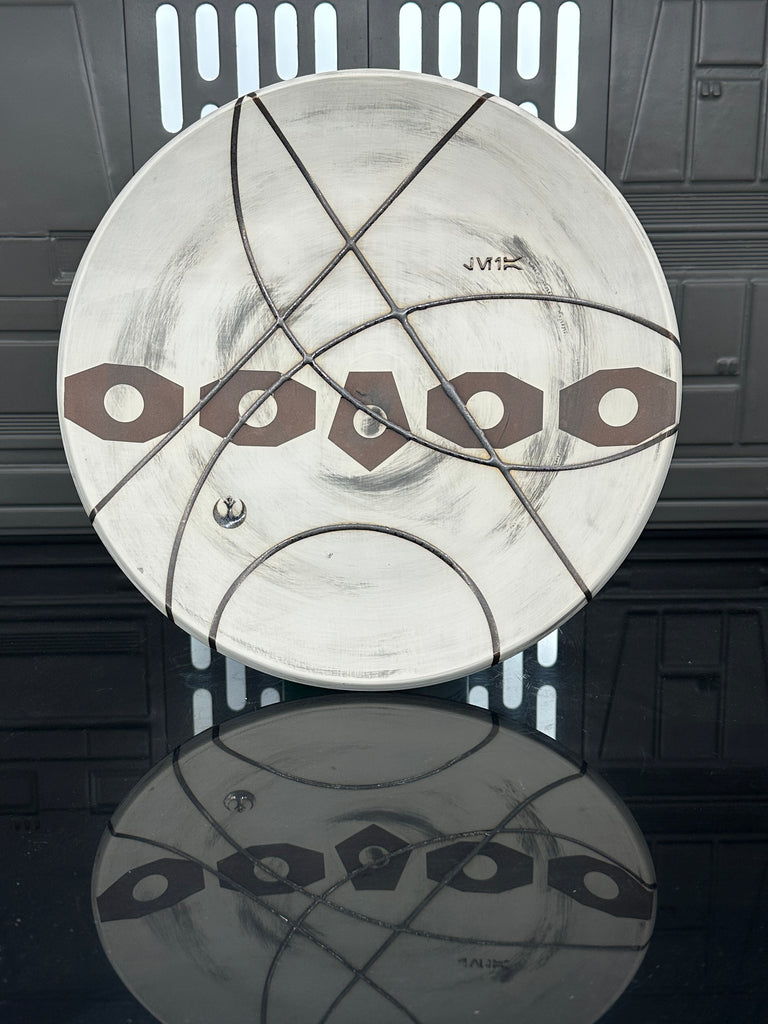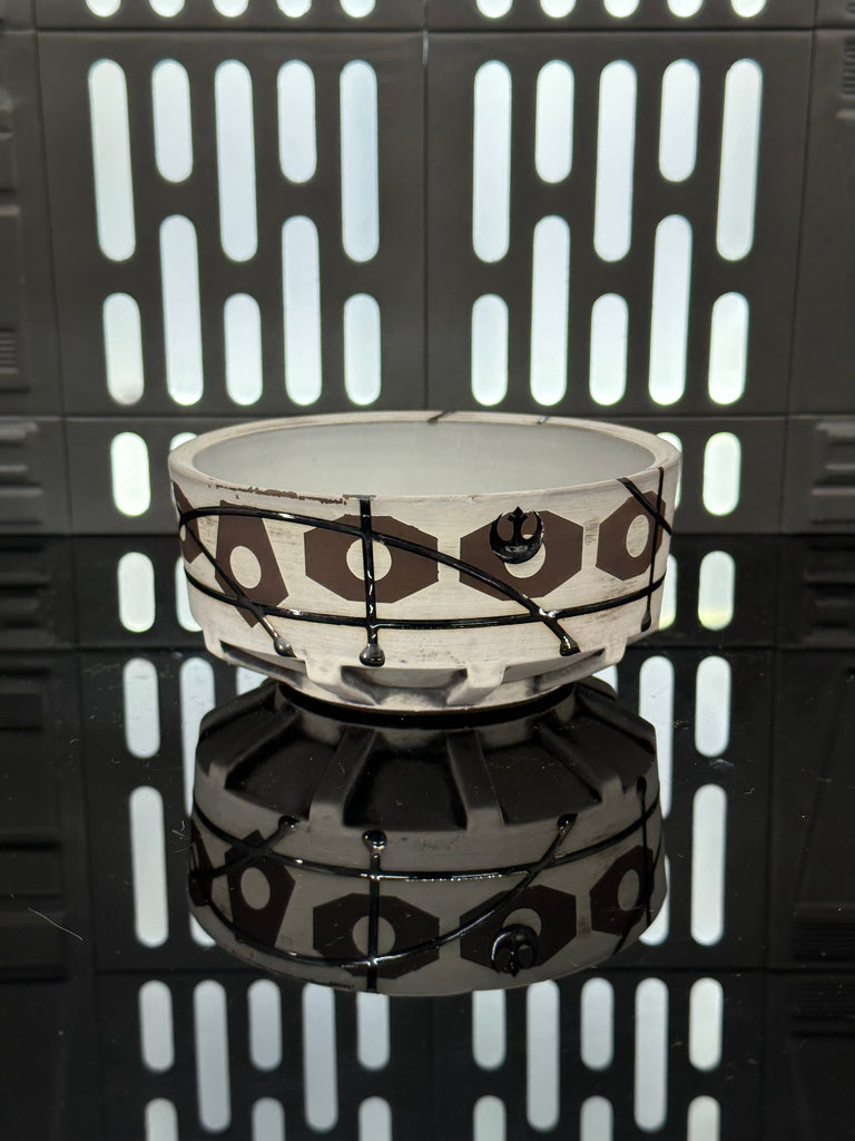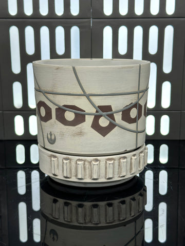 These pieces are inspired by Princess Leia Organa. All pieces will be decorated in white terra sigillata with a pattern derived from the belt buckle Leia wears in A New Hope. Sliver glaze will be used for the lines. The Aurebesh text reads Leia and includes a Rebel Alliance symbol. Each piece is unique and will look similar to the picture but the placement of the pattern, lines, text and signet will change location making each piece unique. You can choose from various forms: Mug, Stein, Rocks Cup, Tumbler, Chili Bowl, Planter, and Serving Bowl.