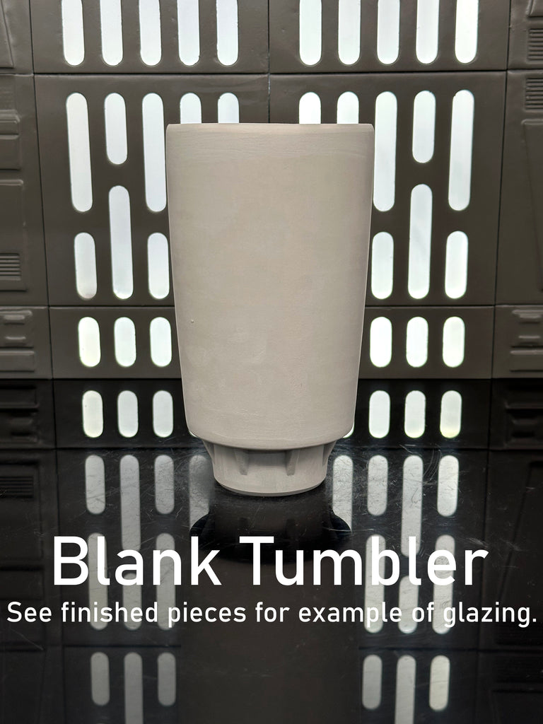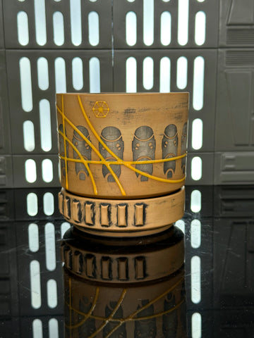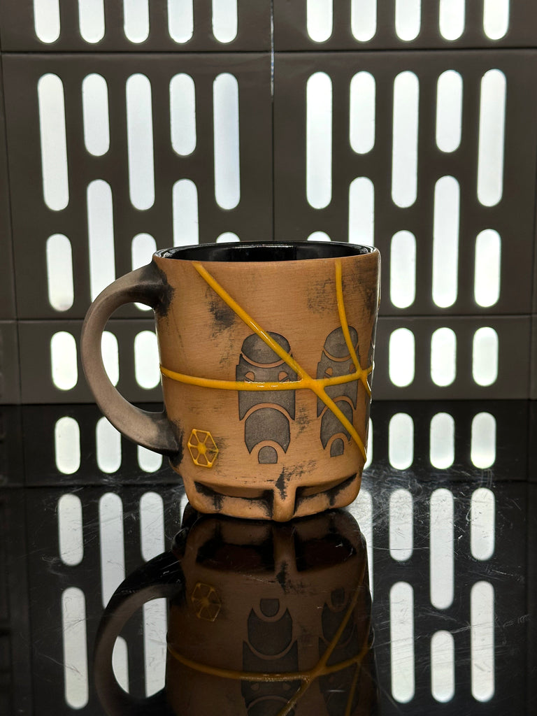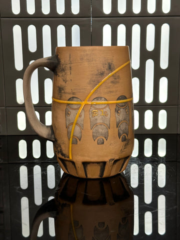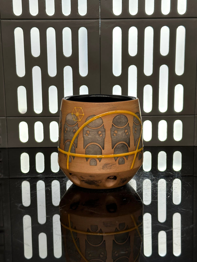 These pieces are inspired by the B-1 Battle Droid. All pieces will be decorated in Tan terra sigillata with a pattern derived from the head of the droid. Yellow glaze will be used for the lines. The Aurebesh text reads B-1 and includes a Separatists symbol. Each piece is unique and will look similar to the picture but the placement of the pattern, lines, text and signet will change location making each piece unique. You can choose from various forms: Mug, Stein, Rocks Cup, Tumbler, Chili Bowl, Planter, and Serving Bowl.