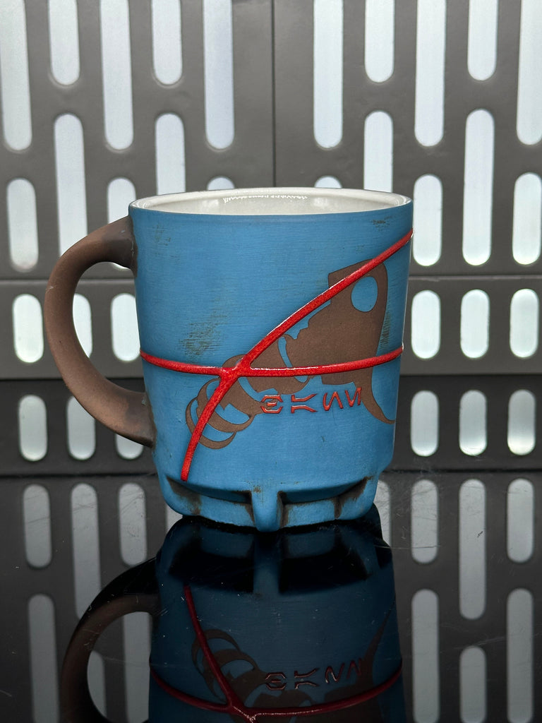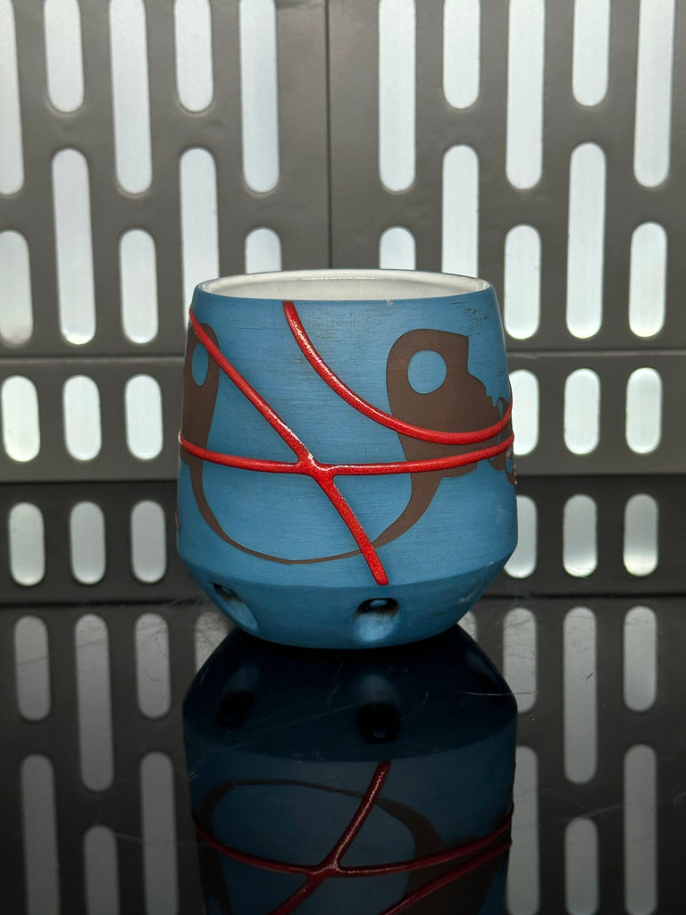 These pieces are inspired by Cad Bane's appearance in The Clone Wars. All pieces will be decorated in blue terra sigillata with a pattern derived from his breathing tubes. Red glaze with orange accents will be used for the lines. The Aurebesh text reads Bane and includes his hat as a symbol. Each piece is unique and will look similar to the picture but the placement of the pattern, lines, text and signet will change location making each piece unique. You can choose from various forms: Mug, Stein, Rocks Cup, Tumbler, Chili Bowl, Planter, and Serving Bowl.
