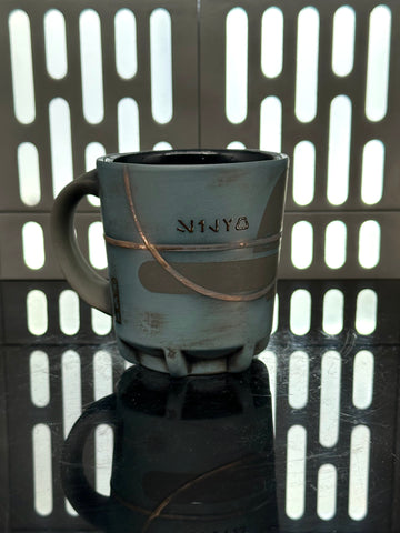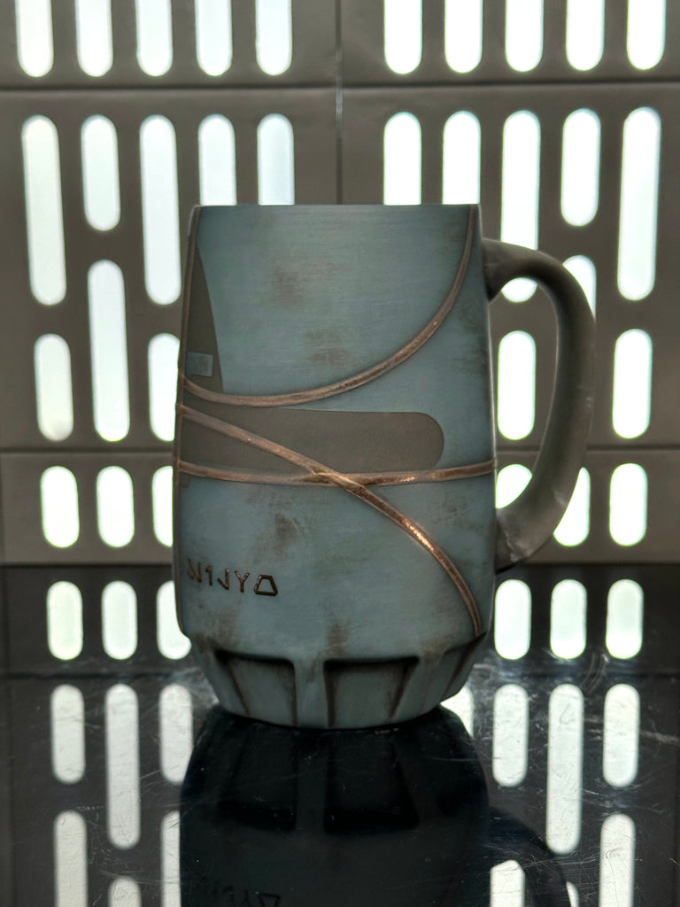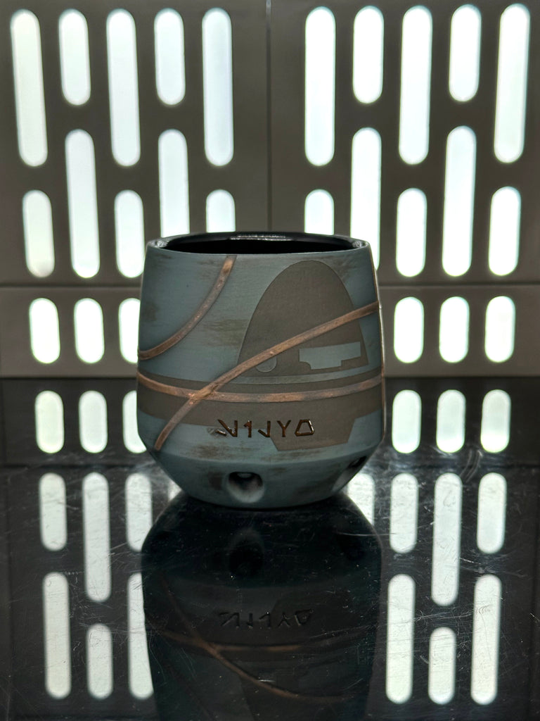 These pieces are inspired by Captian Silvo. All pieces will be decorated in blue terra sigillata with a pattern derived from his helmet visor. Gold glaze will be used for the lines. The Aurebesh text reads Silvo and includes a Credit symbol. Each piece is unique and will look similar to the picture but the placement of the pattern, lines, text and signet will change location making each piece unique. You can choose from various forms: Mug, Stein, Rocks Cup, Tumbler, Chili Bowl, Planter, and Serving Bowl.