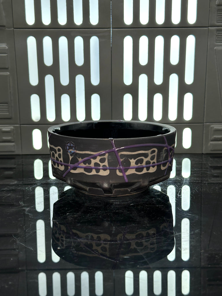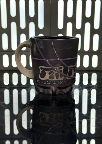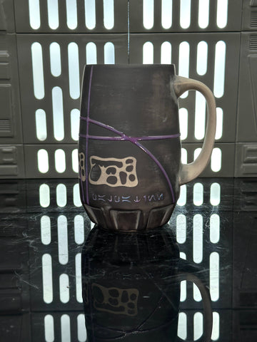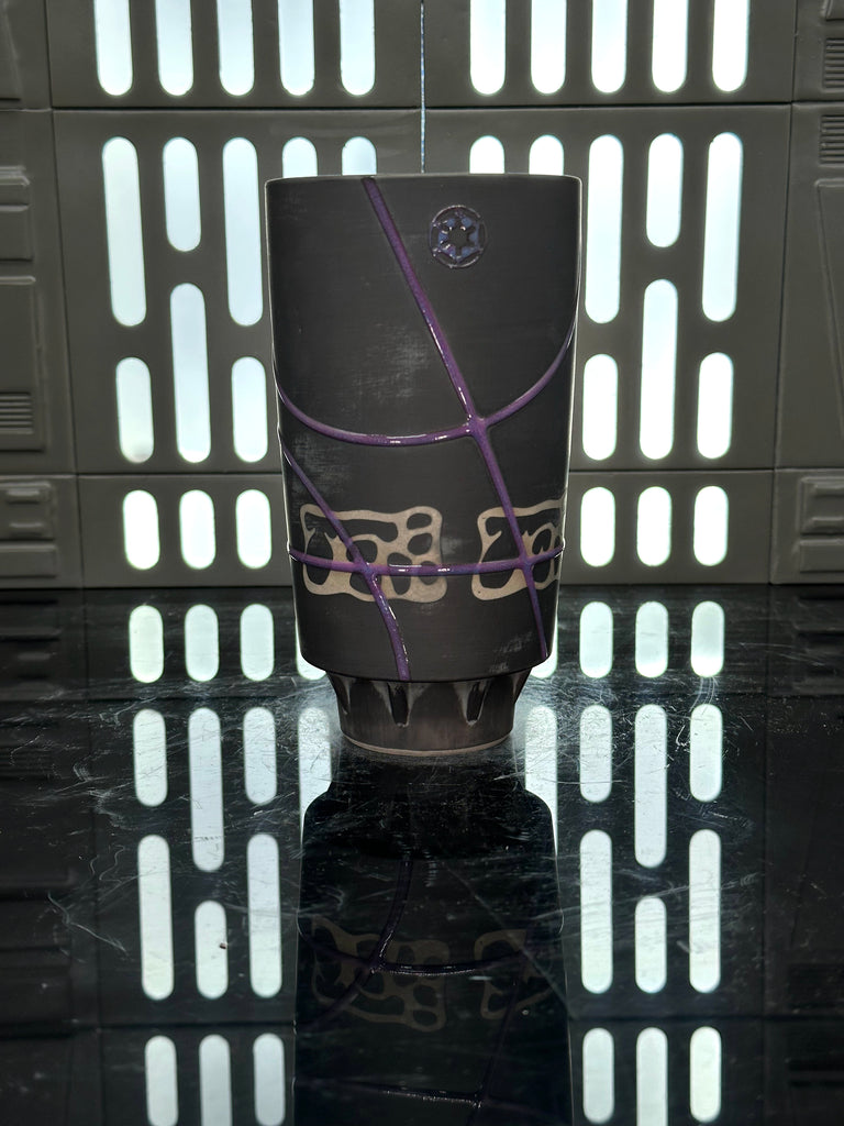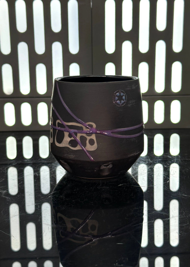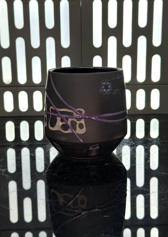 These pieces are inspired by Emperor Palpatine. All pieces will be decorated in black terra sigillata with a pattern derived from his broach that he wears in Return of the Jedi. Purple glaze with blue accents will be used for the lines. The Aurebesh text reads Palpatine and includes a Galactic Empire symbol. Each piece is unique and will look similar to the picture but the placement of the pattern, lines, text and signet will change location making each piece unique. You can choose from various forms: Mug, Stein, Rocks Cup, Tumbler, Chili Bowl, Planter, and Serving Bowl.