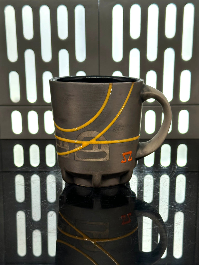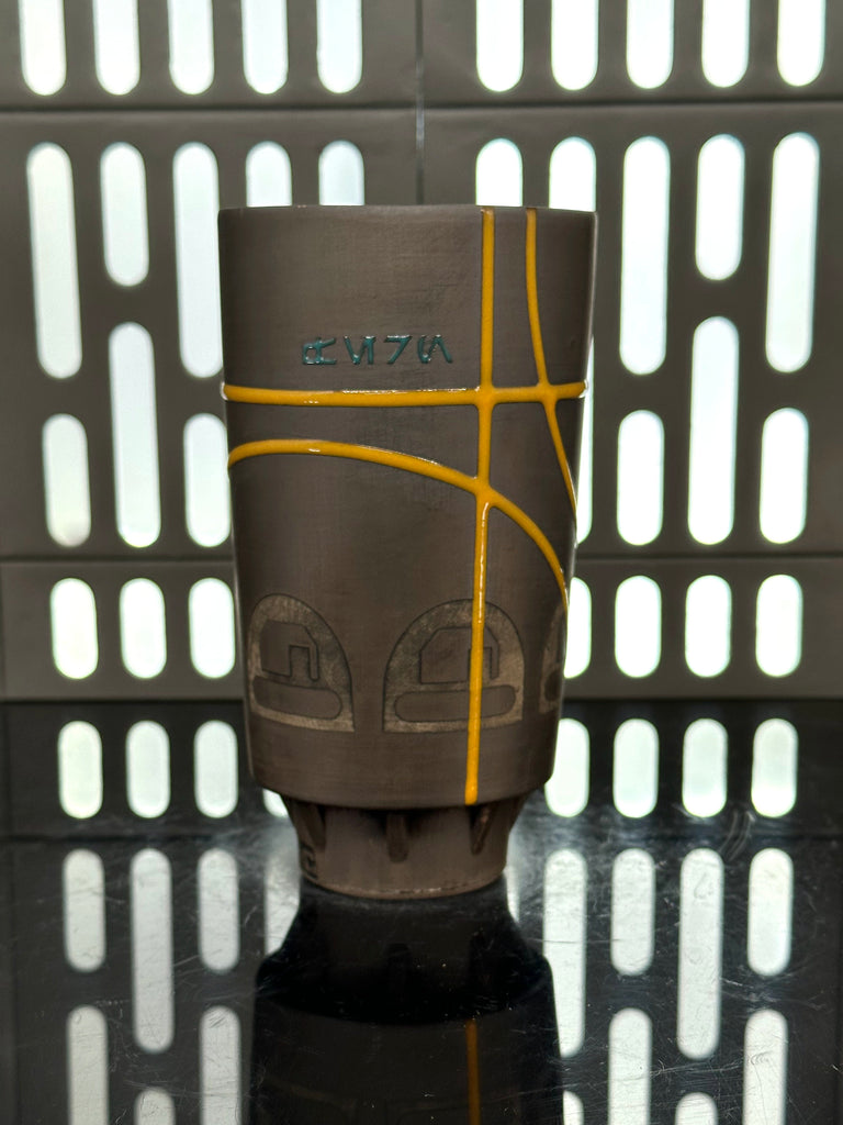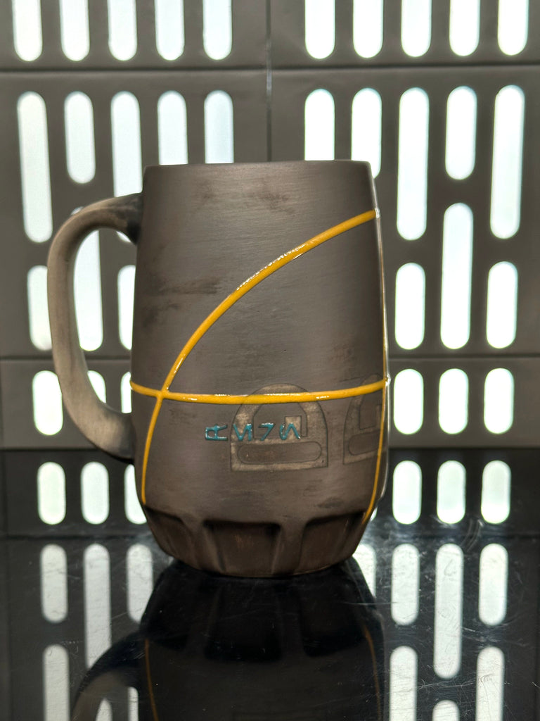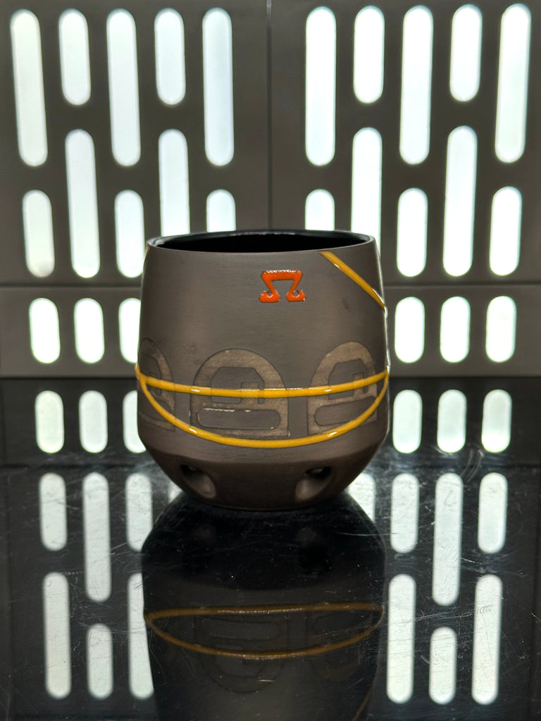 These pieces are inspired by Fern. All pieces will be decorated in brown terra sigillata with a pattern derived from her shoulder patch. Yellow glaze will be used for the lines. The Aurebesh text reads Fern and includes a At Attin symbol. Each piece is unique and will look similar to the picture but the placement of the pattern, lines, text and signet will change location making each piece unique. You can choose from various forms: Mug, Stein, Rocks Cup, Tumbler, Chili Bowl, Planter, and Serving Bowl.