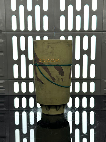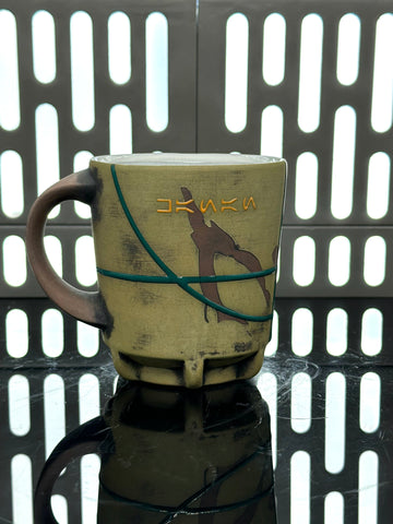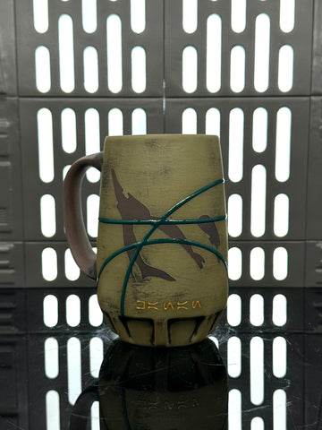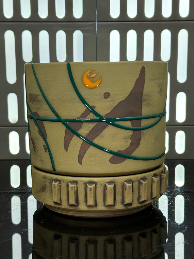 These pieces are inspired by Kanan Jarrus. All pieces will be decorated in green terra sigillata with a pattern derived from the Jaig Eye pattern on his mask. Teal glaze will be used for the lines. The Auebesh text reads Kanan and includes a Pheonix Squadron symbol. Each piece is unique and will look similar to the picture but the placement of the pattern, lines, text and signet will change location making each piece unique. You can choose from various forms: Mug, Stein, Rocks Cup, Tumbler, Chili Bowl, Planter, and Serving Bowl.