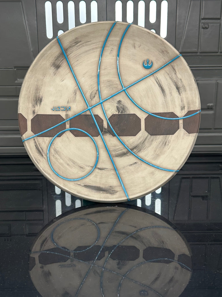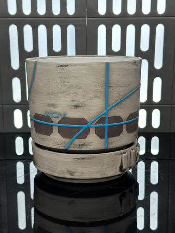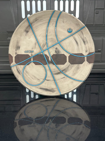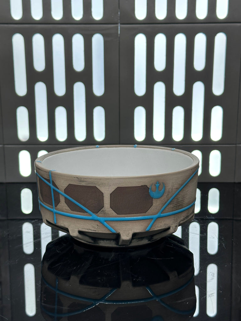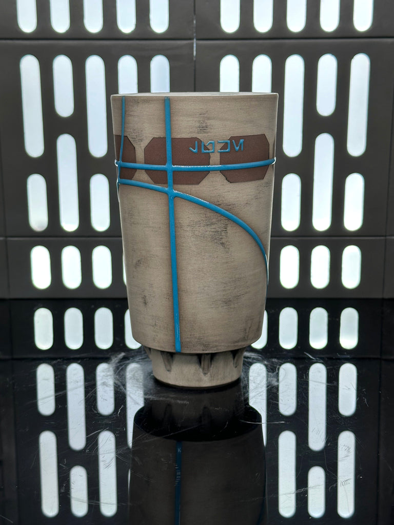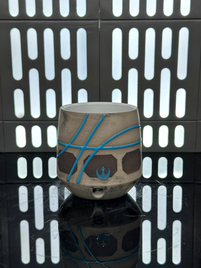These pieces are inspired by Luke Skywalker. All pieces will be decorated in grey terra sigillata with a pattern derived from the belt buckle Luke wears in Empire Strikes Back. Blue glaze will be used for the lines. The Aurebesh text reads Luke and includes a Rebel Alliance symbol. Each piece is unique and will look similar to the picture but the placement of the pattern, lines, text and signet will change location making each piece unique. You can choose from various forms: Mug, Stein, Rocks Cup, Tumbler, Chili Bowl, Planter, and Serving Bowl.