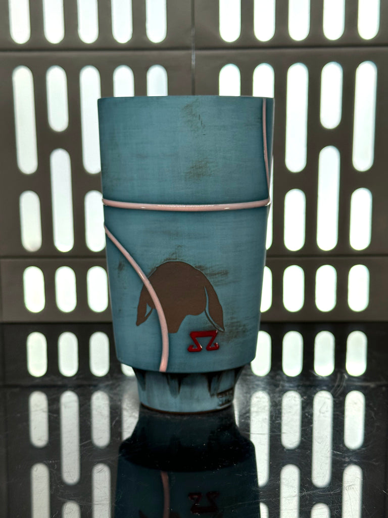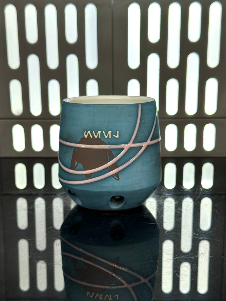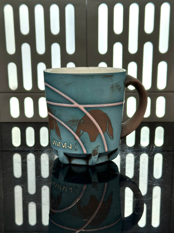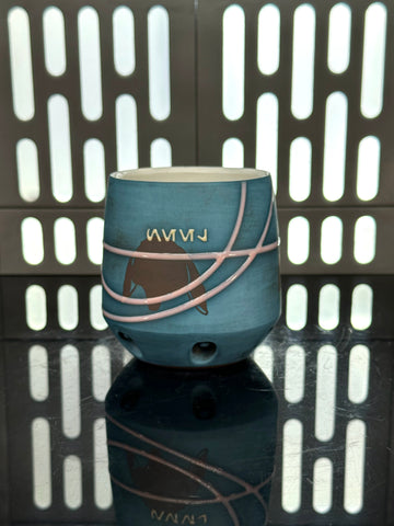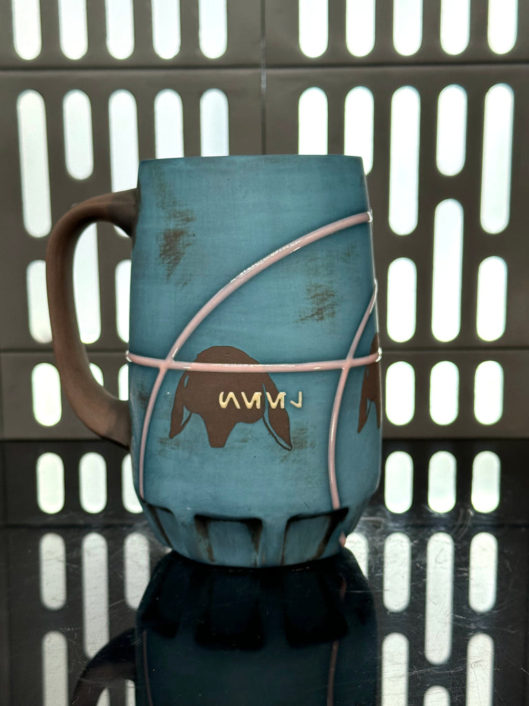 These pieces are inspired by Neel. All pieces will be decorated in blue terra sigillata with a pattern derived from his head. Pink glaze will be used for the lines. The Aurebesh text reads Neel and includes a At Attin symbol. Each piece is unique and will look similar to the picture but the placement of the pattern, lines, text and signet will change location making each piece unique. You can choose from various forms: Mug, Stein, Rocks Cup, Tumbler, Chili Bowl, Planter, and Serving Bowl.