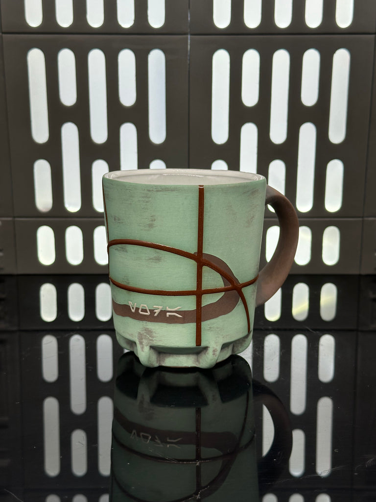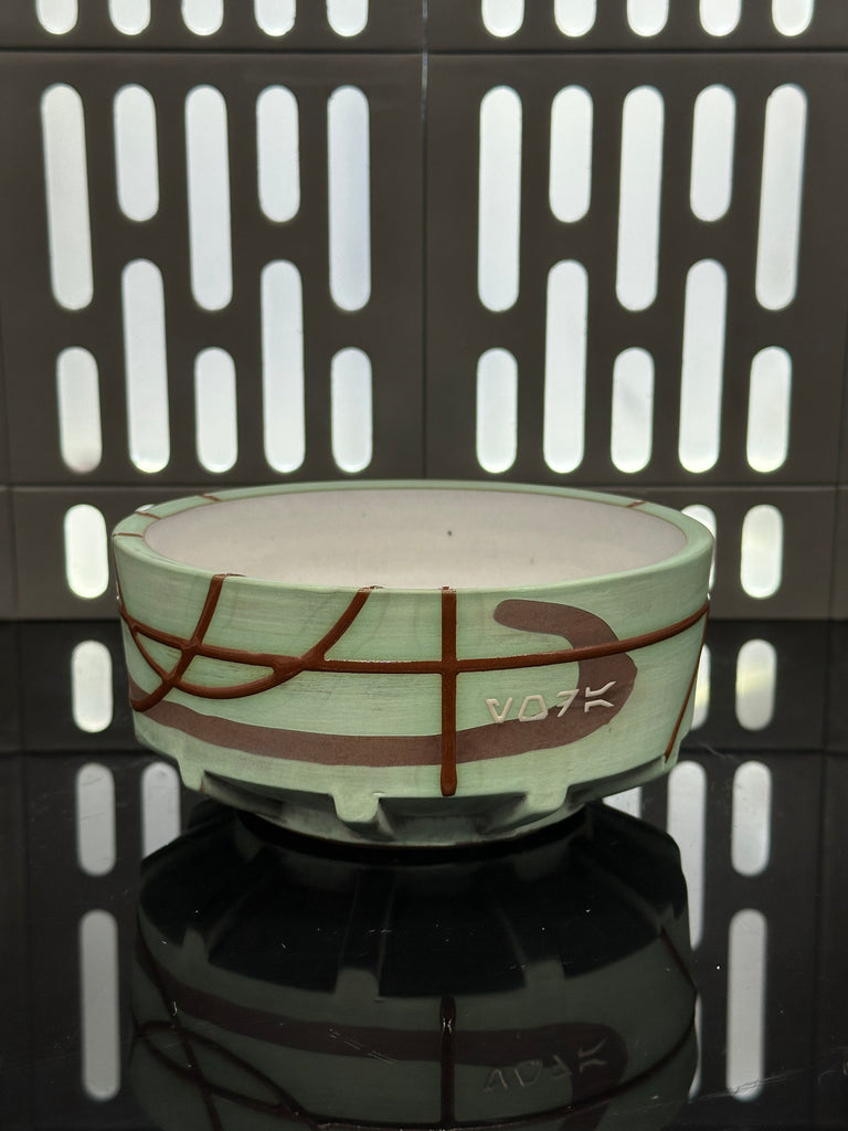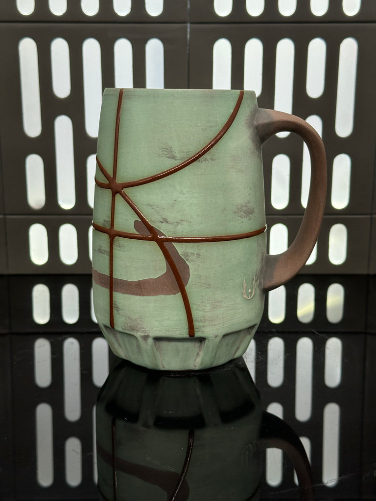 These pieces are inspired by Master Yoda. All pieces will be decorated in green terra sigillata with a pattern derived from the gimmer stick he carries in The Empire Strikes Back. Brown glaze will be used for the lines. The Auebesh text reads Yoda and includes a Jedi Order symbol. Each piece is unique and will look similar to the picture but the placement of the pattern, lines, text and signet will change location making each piece unique. You can choose from various forms: Mug, Stein, Rocks Cup, Tumbler, Chili Bowl, Planter, and Serving Bowl.