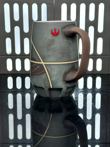 Enjoy your favorite beer in this stein inspired by the Star Wars character Jyn Erso. The Aurebesh text reads Jyn and has a Rebel Alliance signet by the handle.