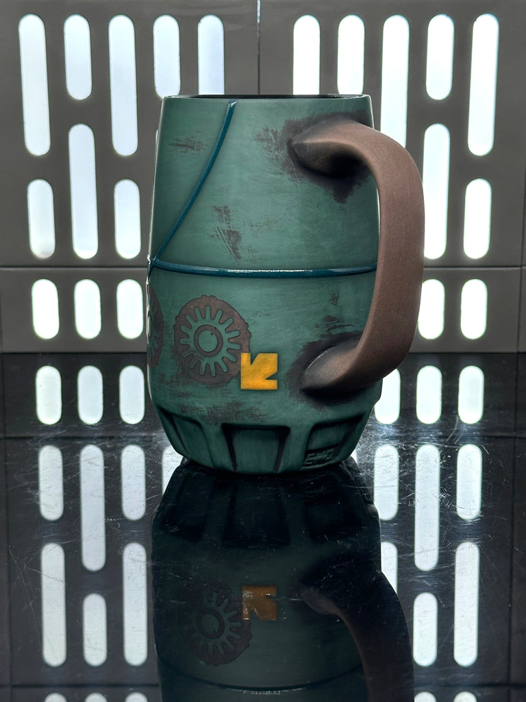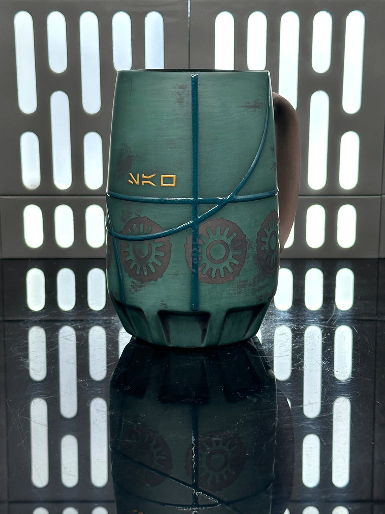 Enjoy your favorite beer in this stein inspired by the Star Wars character Saw Gerrera. The Aurebesh text reads Saw and has Saw's Militia signet by the handle.