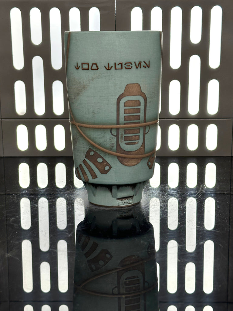 Enjoy your favorite beer or cold beverage in this tumbler inspired by the Star Wars character Two Tubes. The aurebesh text reads Two Tubes and has Saw's Militia signet.