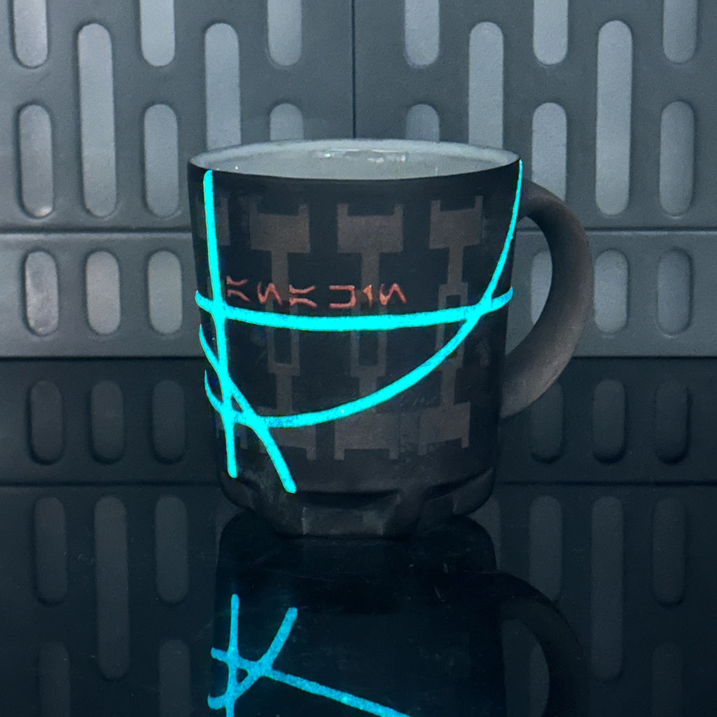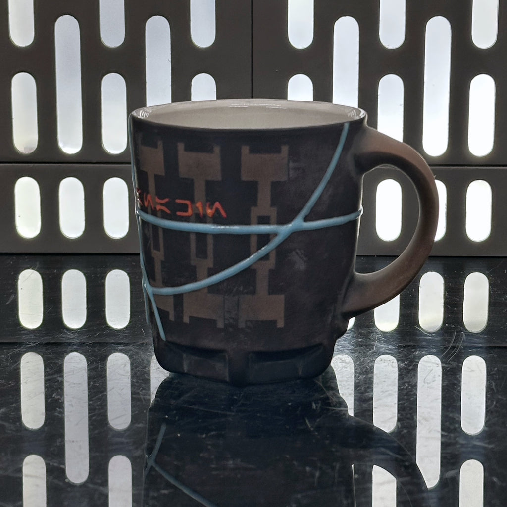 These pieces are inspired by Jedi Knight Anakin Skywalker All pieces will be decorated in black terra sigillata with a pattern derived from his Gauntlet. Glow-in-the-Dark Blue glaze will be used for the lines. The Aurebesh text reads Anakin and includes a Jedi Order symbol. Each piece is unique and will look similar to the picture but the placement of the pattern, lines, text and signet will change location making each piece unique. You can choose from various forms: Mug, Stein, Rocks Cup, Tumbler, Chili Bowl, Planter, and Serving Bowl.