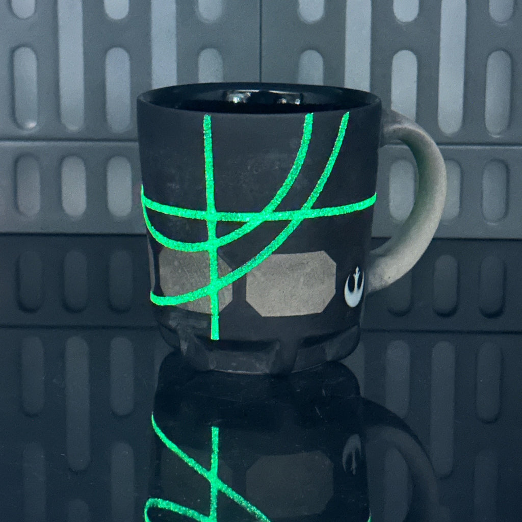 These pieces are inspired by Jedi Knight Luke Skywalker All pieces will be decorated in black terra sigillata with a pattern derived from his Belt Buckle. Glow-in-the-Dark Green glaze will be used for the lines. The Aurebesh text reads Luke and includes a Rebel Alliance symbol. Each piece is unique and will look similar to the picture but the placement of the pattern, lines, text and signet will change location making each piece unique. You can choose from various forms: Mug, Stein, Rocks Cup, Tumbler, Chili Bowl, Planter, and Serving Bowl.